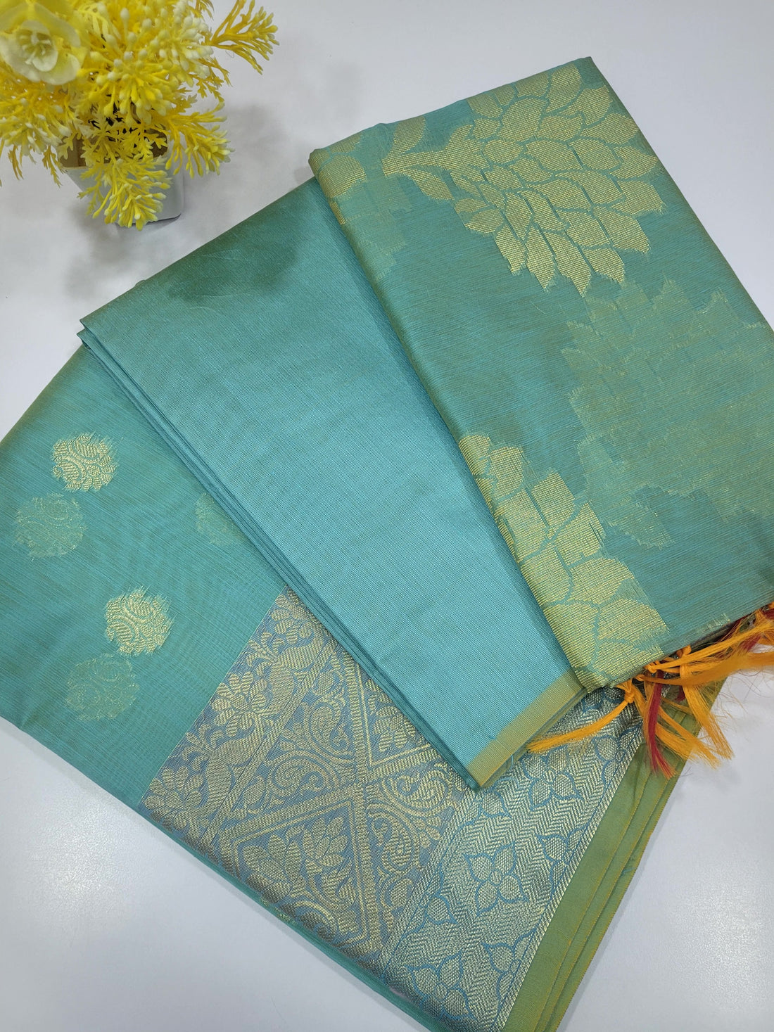 Dual Tone Blue & Green Soft Silk Saree | 50% Pure Mix Handloom | Raindrop & Putta Motifs