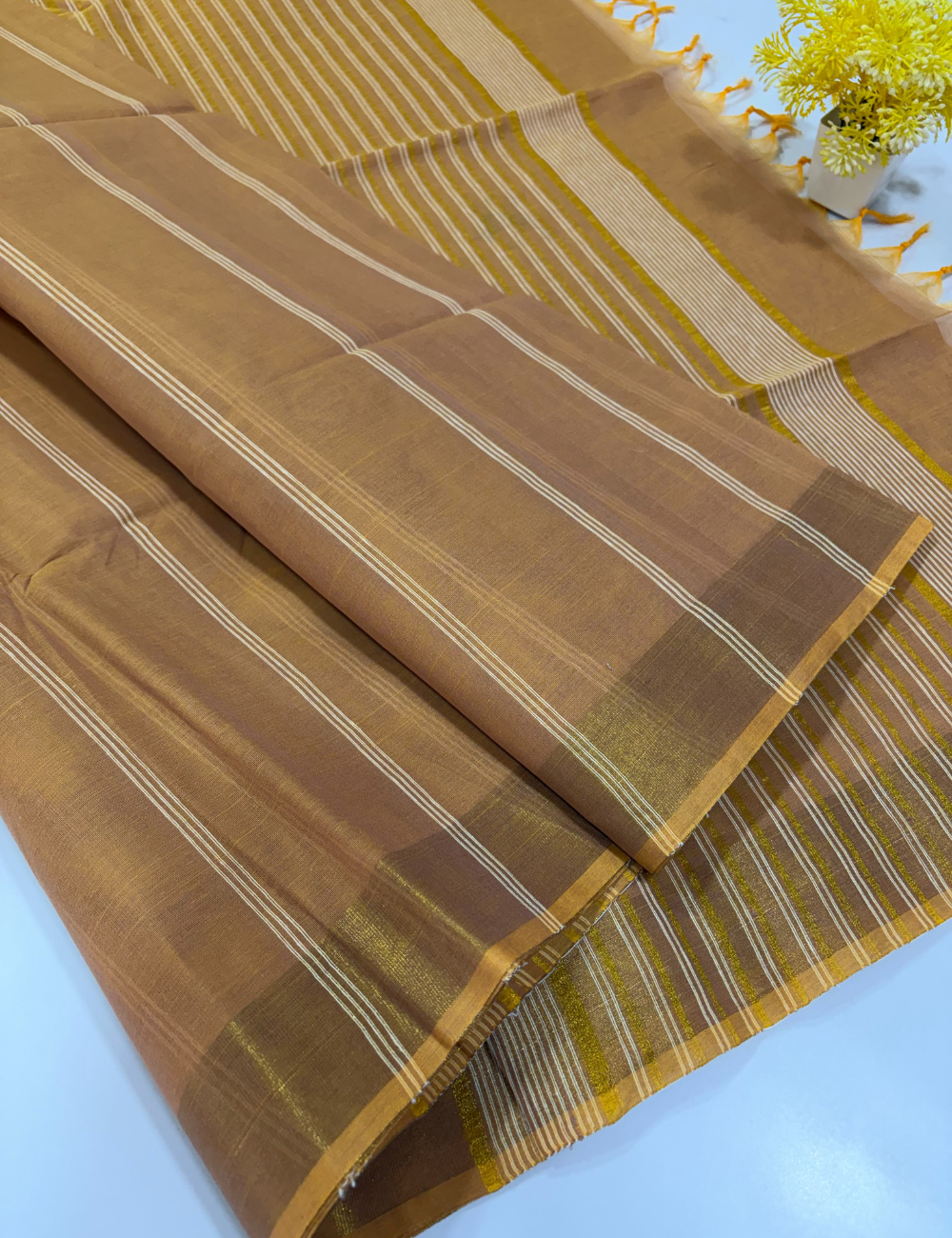Deep Mustard Brown Pure Cotton Saree with Gold Jari Border