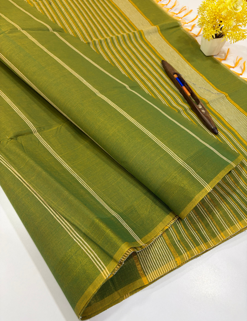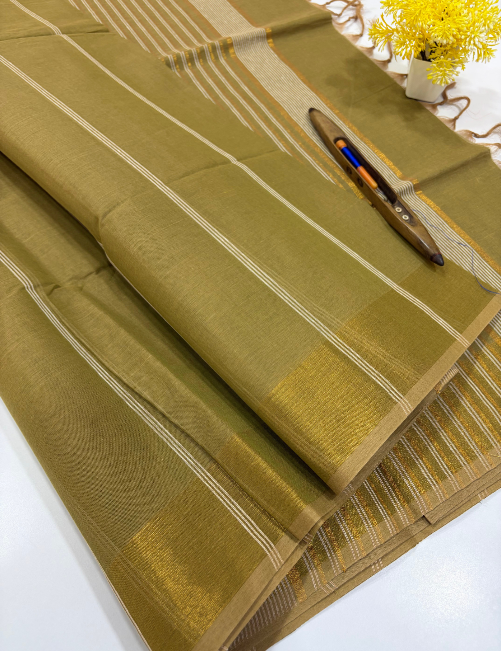 Olive Mustard Pure Cotton Saree with Rich Gold Jari Border