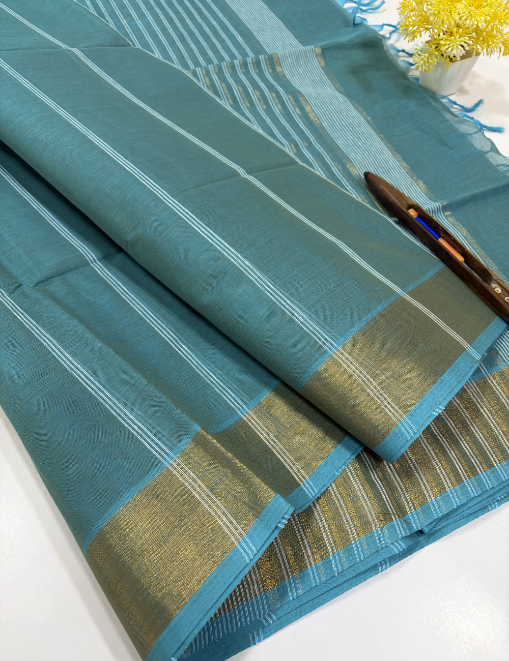 Peacock Teal Pure Cotton Saree with Gold Jari Border