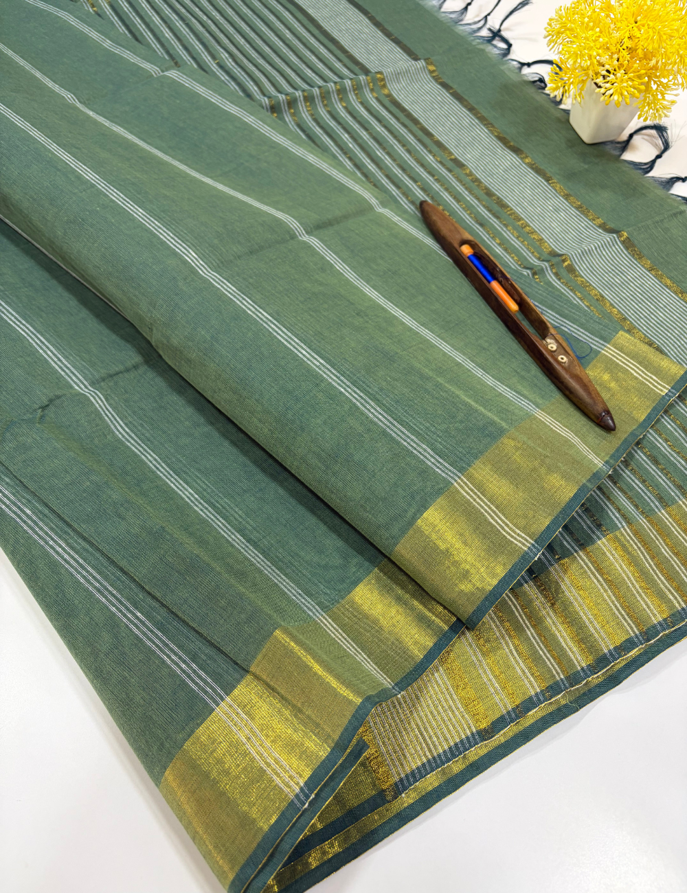 Sage Green Pure Cotton Saree with Gold Jari Border