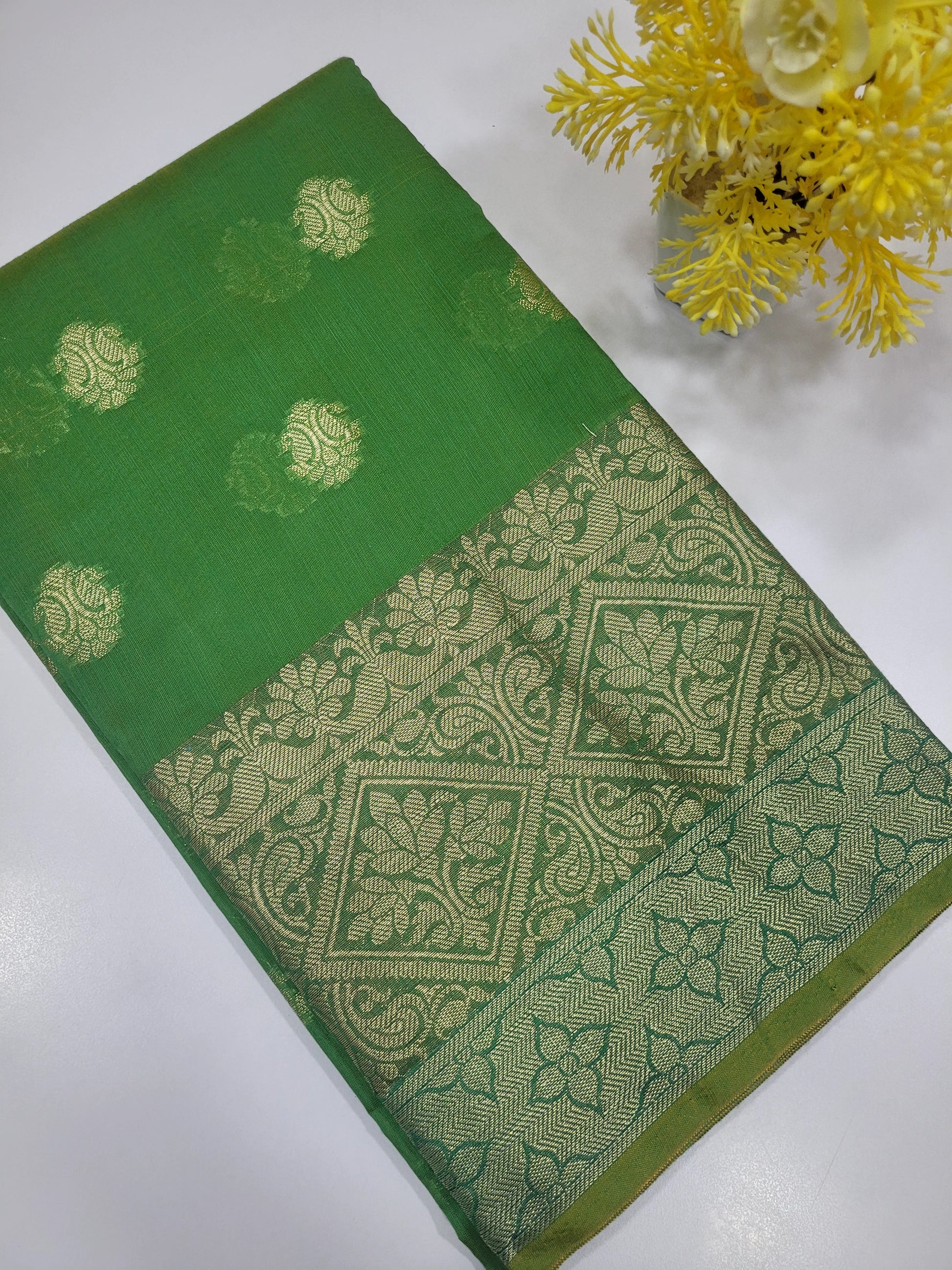 Celebrate tradition with elegance in this beautiful green 3-piece unstitched handloom silk cotton salwar set. The top fabric features a traditional woven border, enhancing its ethnic charm. Paired with a matching self-colour cotton bottom and a grand full brocade shawl, this set is ideal for festive occasions, temple functions, weddings, and gifting.